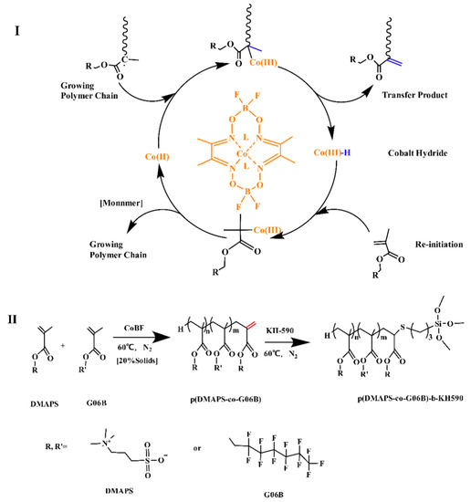 The flowchart showing the synthesis process of the betaine copolymer is illustrated in Figure 1I, while the synthesis diagram via catalytic chain transfer polymerization (CCTP) is shown in Figure 1II. The first step is to use CoBF as the chain transfer catalyst, AIBN (used after recrystallization) as the initiator, trifluoroethanol (TFE) as the solvent, and DMAPS and G06B as the copolymerization monomers. The reactants were dissolved in a single-necked flask and sealed, N2 gas was blown for 0.5 h, and they were then reacted in a 60 °C water bath for 12 h to obtain p(DMAPS-co-G06B). The reaction was continued at 60 °C for 12 h with the addition of AIBN and KH-590, and finally, it was extracted with ethanol precipitation 3 times and then vacuum-dried at 60 °C for 36 h to obtain p(DMAPS-co-G06B)-b-KH590. The contents of monomer DMAPS, CoBF, and G06B for the betaine polymer copolymerization is recorded in Table 1.