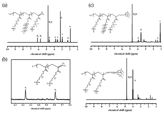 It can be seen from Figure 2a that the 1H–NMR spectrum of the betaine copolymer containing the ω-vinyl group (δ = 6.16 ppm, δ = 5.75 ppm is the chemical shift of the vinyl proton peak) was similar to the predicted structural spectrum. This proves that the temperature-sensitive copolymer containing ω-vinyl at one end was successfully synthesized.