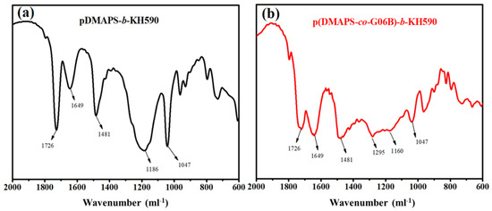 The FTIR spectrum of copolymer (a) PDMAPS + CoBF(40 ppm) (RUN 4); (b) PDMAPS + G06B + KH590 + CoBF(40 ppm) (RUN 5).
