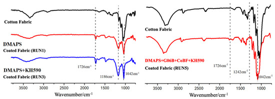 FTIR-ATR was used to investigate the characteristic functional groups on cotton fabric before and after betaine copolymer treatment. FTIR-ATR spectra of control cotton fabric and cotton fabric with DMAPS + G06B + CoBF + KH590 (RUN 5) samples are presented in Figure 4.