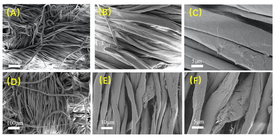 SEM images of cotton fabric with different magnifications: (A–C) Before finishing cotton fabric; (D–F) after p(DMAPS-co-G06B)-b-KH590 (RUN5) finishing treatment.