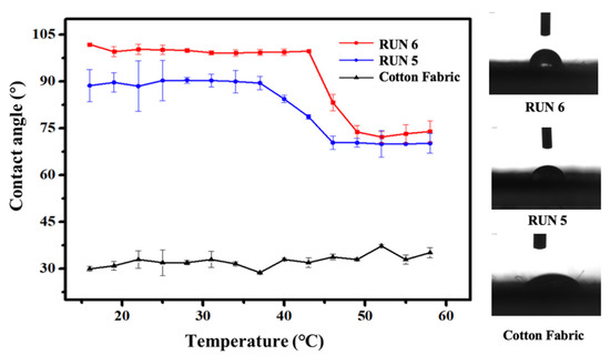 It can be obtained from Figure 6 that the average contact angle of RUN 5 had a higher variation under 20–30 °C, due to the average contact angle being directly related to the upper critical solution temperature (UCST) of PDMAPS. If the temperature was lower than the UCST, the intramolecular hydrogen bonds in PDMAPS formed and the PDMAPS coating was hydrophobic. Otherwise, the PDMAPS molecular chain stretched and formed hydrogen bonds with water in the environment. The RUN 5 had a higher content of DMAPS, and the UCST of PDMAPS was around 20–30 °C, resulting in the average contact angle of RUN 5 having higher variation under 20–30 °C.