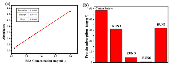 A standard concentration gradient of BSA/PBS solution was prepared to test the absorbance at the maximum absorption wavelength with an ultraviolet-visible absorbance photometer to obtain the standard adsorption curve of BSA concentration and absorbance, as shown in Figure 7a. The initial concentration of the protein solution was 1.0 mg/mL, for the easy observing of the protein adsorption behavior of treated fabric, the BSA concentration was doubled, and the maximum range of 2.0 was set. If the maximum was smaller than 2.0, the measured protein adsorption behavior would not be good enough. Otherwise, the experimental error would be amplified, which would make the results unreliable.