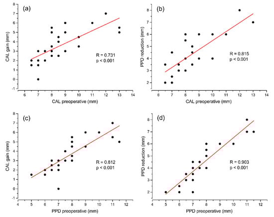 Similar correlations were found for PPD reduction, where PPD reduction strongly correlated with preoperative PPD and CAL (respectively: r = 0.903, p < 0.001, r = 0.815, p < 0.001), CAL gain (r = 0.936, p < 0.001), IB component (r = 0.484, p < 0.01) and CEJ-BD (r = 0.601, p < 0.001).