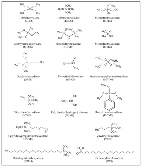 A class of compounds that are well suited for a fine design of thin films, including the wettability, are the alkoxides and organically modified alkoxides or organosilanes (Figure 1). They are employed as the reactive compounds for sol–gel chemistry to prepare functional thin films but are also used as surface modifiers and primers. The organically modified alkoxides are characterized by one or more covalent Si-C bonds that do not react during the sol–gel reactions of hydrolysis and condensation [11]. They can be applied for modifying the surface of different types of materials, e.g., glass or silicon wafers, from hydrophilic to hydrophobic and vice versa, through the chemical and physical tailoring of the surfaces [12]. An advantage of the solution processing route is the possibility of achieving a highly tailored coating design in terms of composition, thickness, surface roughness, contact angle, and mechanical properties. Thin layers can be simply applied on a wide variety of surfaces, i.e., ceramics, glass, metals, and polymers of different shape and compositions. The film can be deposited using several deposition techniques, such as dip-coating, spin-coating, doctor blade, and spray-coating, just to name the main one [13,14]. The composition of the functional coating can be largely adjusted by controlling the sol–gel chemistry. Alkoxides or organically modified alkoxides can be used alone or in combination for preparing the precursor solution. Organically modified alkoxides, in particular, offer the possibility of adding specific functionalities to the coatings by the organic modifier, such as epoxy [15], methyl, or aminic groups. Playing with composition, amount, and type of functional organic groups, thin films with specific hydrophilic-hydrophobic properties have been developed and applied in several fields [16,17]. The development of these functional coatings needs careful control of the mechanical properties and chemical durability [18,19].