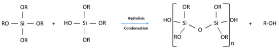 Illustration of the reaction of silicon alkoxides to form a silica network. R = alkoxy.