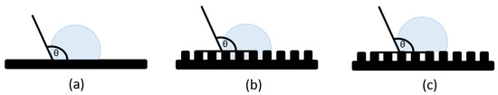 Measuring the contact angle is one of the fastest and most common methods for evaluating the hydrophobic-hydrophilic nature of a surface. The earliest studies of contact angle and surface wettability date back to the early 1800s, when Thomas Young attempted to explain his hypothesis about the factors influencing interactions at the interface between a smooth solid and a liquid [32]. Two other regimes were later formulated, the Wenzel [33] and the Cassie–Baxter [34] regimes (Figure 4).