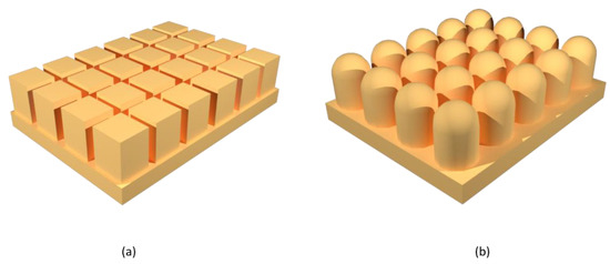 In general, it is possible to convert the hydrophilic character of a surface into a hydrophobic one applying the proper structural modification [39]. A. Marmur et al. have described an ideal method for designing a hydrophobic surface [40]. In their work, they have studied the parameters that affect the hydrophobicity of the surface, taking into account mainly two morphological models (Figure 5): the flat-top and the semicircular. Both models follow the Cassie–Baxter regime. In the flat-top model, the water droplet does not enter between the pillars but stays on their surface, thanks to the air trapped at the interface. In the semicircular model, the pillars have a rounded shape, which causes the water droplet to flow over them, penetrating the structure and decreasing the hydrophobic character.