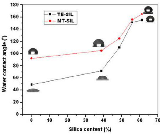 Effect of the concentration of hydrophobically modified silica nanoparticles on the water contact angle of sol–gel composite coatings prepared with sols of TEOS and MTES. Reproduced with permission from [41].