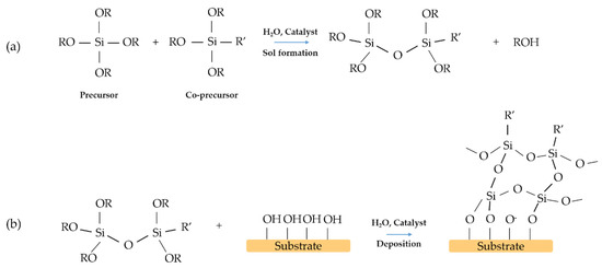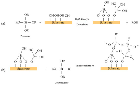Example scheme of a one-step reaction: (a) preparation of the sol, (b) deposition of the film on the substrate. R and R’ organic groups. R’ is the functional group covalently bonded to silicon.