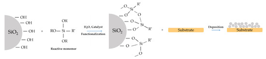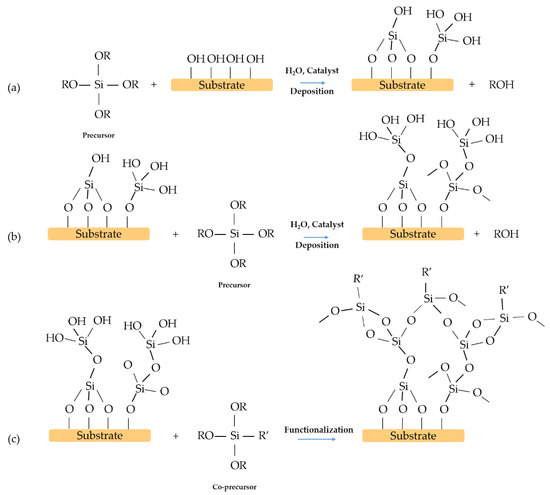 The one-step deposition of functional layers via solution processing is the simplest method and from the industrial point of view has several advantages as reduces the processing time and complexity of the process. It also offers the possibility of large-scale implementation. In general, a hybrid organic-inorganic single layer is enough to modify the contact angle of the material. The precursor is obtained by controlled co-hydrolysis and condensation of different alkoxides to obtain a homogeneous and transparent sol [43]. The resulting film is usually composed of a silica network modified with an organic group, R’, which could play the role of the hydrophobic moiety of the interface (Figure 8).