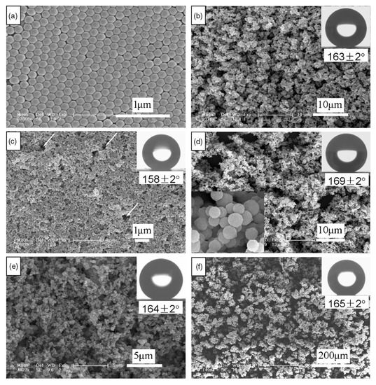 FESEM micrographs of (a) the unmodified silica nanoparticles with diameters of 167 nm and the vinyl-modified silica nanoparticles with different diameters: (b) 85 nm, (c) 167 nm, (d) 360 nm, (e) 453 nm, and (f) 1600 nm. The insets on the top right corners are the corresponding profiles of water drops on the surfaces and the water contact angles. The inset on the bottom left of (e) shows the enlarged particles. Reproduced with permission from [68].