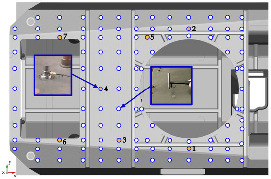 This study was carried out using experimental modal analysis, a technique commonly used for studying dynamic mechanical object properties, at both the design and machine operation stages. Identification tests used for experimental modal analysis rely on forcing an object to vibrate while simultaneously measuring the driving force and system response, often in the form of vibrational acceleration spectra. The tests used a B&K type 8202 impact hammer (Hottinger Brüel & Kjær A/S, Virum, Denmark) and B&K type 4395 ICP accelerometers (Hottinger Brüel & Kjær A/S, Virum, Denmark). The measuring system was used an 8-channel vibration conditioner Sirius+ (DEWESoft d.o.o., Trbovlje, Slovenia) with a DEWESoft X3 system software (DEWESoft d.o.o., Trbovlje, Slovenia). The upper hull plate was marked with 114 measuring points to be excited using an impact hammer. The system response was recorded using seven accelerometers arranged in the configuration shown in Figure 2. In this diagram white and orange dots indicate where the hammer struck, while orange dots indicate accelerometer locations. The distribution of measurement points is dictated by two factors. The first is the reliable representation of the vibration modes. The denser the measurement grid, the greater the accuracy of the description of the successive modes of vibration. If the measurement grid is too sparse, there is a risk that the vibration modes will not be detected or will be misidentified [22]. The second factor in limiting the grid’s density are the areal or local stiffening of the structure, such as structural reinforcement profiles (Figure 2), elements allowing the installation of additional panels to increase the protection of the crew, and structural openings. The roof hull plate has two such openings. The first, located at the front, is intended for the installation of the turret system. The second is located in the rear section and is used to install hatches. Seven accelerometers were placed across the entire plate surface. Two at the level of the turret opening (Nos. 1 and 2), two near the hatch opening (Nos. 6 and 7) and three (Nos. 3, 4, 5) between the structural openings. The location of the accelerometers was determined based on preliminary numerical tests. Increased vibration amplitudes of the roof hull plate were observed for the indicated locations.