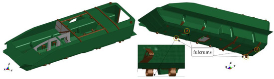 To determine the frequency and mode shape of natural vibrations, a numerical model of the transporter hull was prepared. The base hull model (Figure 3) is composed of approximately 147,000 fully integrated shell elements. The average edge length of the element is about 20 mm.