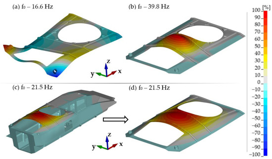 Figure 4 presents an example illustrating the impact of boundary conditions on natural frequencies and mode shape of the roof hull plate. Calculations were made for a free plate (Figure 4a) and one fixed on its edge (Figure 4b). Figure 4c shows the calculation of the obtained results for the entire hull. For ease of comparison with the previous ones, Figure 4d shows only the roof fragment. 21.5 Hz is the lowest natural frequency associated with the roof hull plate only. Of course, there are also lower ones, but they are associated with the natural vibrations of the hull as a whole (mainly bending and torsion of the hull in various planes).