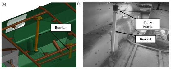 Figure 7. Conf. 4 (base hull, two roof hull plate brackets, bearing and turret): (a) FEM model, (b) test object.