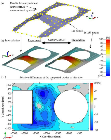 Vibration mode shape comparison: (a) Results from experiment (coarse point grid), (b) visual mode comparison (finer experimental grid after interpolation, equal to FE model), (c) relative difference of compared modes (experimental vs. numerical investigation).