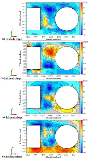 For each configuration measurements were conducted using the modal hammer method for the adopted measuring grid. A similar modal analysis was performed using numerical studies. Figure 9 summarises the experimental and numerical test results for the first configuration, while Figure 10 shows a comparison of the relative differences for the first four mode shapes of transporter hull vibration. There is a high correspondence between the results, both in terms of the determined natural vibration frequency and form. In the majority of the plate, the differences in relative displacement did not exceed 10%. In a few small areas, larger differences were measured, but did not exceed 30%. At the same time, an increase in non-compliance for higher vibration mode shapes was observed.