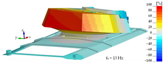 The same figures for subsequent vibration frequencies of the plate were obtained using the mounted turret bearing and the roof hull plate brackets. Minor changes were observed in the frequency values associated with structural rigidity, and significant differences were seen in the turret-mounted configuration (IV). Using an impact hammer, it was not possible to generate vibrations associated with turret movement. Figure 11 shows the 1st shape obtained through FEM analysis is associated with rotational movement of the turret along the y axis. Figure 12 shows comparison of the experimental and numerical calculation results regarding the roof hull plate, and Figure 13 provides a map of relative differences in vibrational frequencies (experiment vs. simulation). In numerical calculations, the first frequency of plate vibration with the turret was approximately 13 Hz.