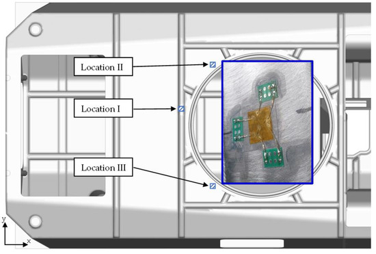 During the tests, the values of forces in the supports, the acceleration values at selected points of the plate and the deformation of the plate were measured. The arrangement of strain gauge rosettes is shown in Figure 15. Their location was selected on the basis of the results of preliminary simulation tests [26] indicating the areas of stress concentration on the roof hull plate that appear during firing. The first area is the reinforcement of the top plate of the transporter, located behind the turret opening in the plane of symmetry of the transporter. Unfortunately, due to the structural opening in the vicinity of this area, it was decided to move it away (Location I). The second and third areas are located between the brackets of the top plate supports and the bearing rail—on both sides. Due to the nature of the deformation of the plate, associated with its flexural vibrations, the dominant direction of deformation was the Y direction.