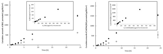 The highest penetration of studied compounds was generally observed in the time range 3 to 5 h for Strat-M® membrane as well as human skin (Figure 5).