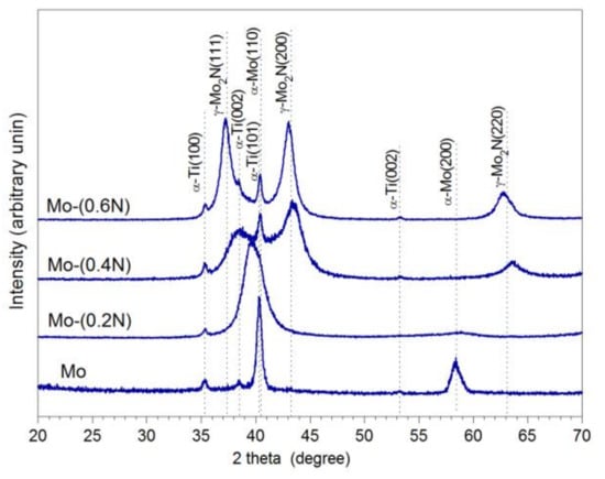 - Wang, T.; Zhang, G.; Ren, S.; Jiang, B. Effect of nitrogen flow rate on structure and properties of MoNx coatings deposited by facing target sputtering. J. Alloys Compd. 2017, 701, 1–8. [Google Scholar] [CrossRef]