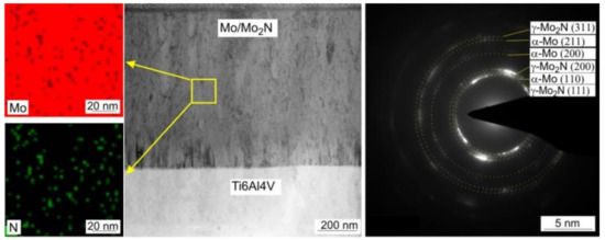 A novelty of this work is the production of Mo-Mo2N nanocomposite coating, deposited on Ti6Al4V alloy and characterized by low tribological wear. To the authors’ knowledge, there is no research work in the available literature on Mo-Mo2N composite deposited on Ti6Al4V alloy. Earlier works were related to a single-phase Mo2N, MoN, or multi-phase Mo2N/MoN coatings deposited on metallic substrates.