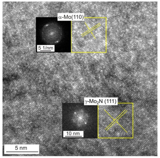 HRTEM image of Mo-N(0.6) coating with FFT transformations from areas marked by yellow frames. Visible crystallites of α-Mo (110) and γ-Mo2N (111).
