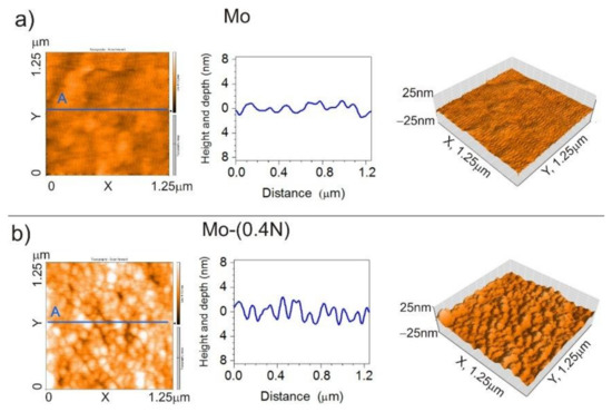 Geometrical structure of the surface determined by the AFM confirms columnar structure of the coating. Changes in topography correspond to the size of the columnar grains. Columnar grains visible on the surface with the growth direction perpendicular to the substrate have a diameter ranging from 100 nm to 200 nm in Mo (Figure 5a) and Mo-(0.2N) coatings. In the Mo-(0.4N) (Figure 5b) and Mo-(0.6N) coatings, with nitrogen concentrations of 12.1 at.% and 18.6 at.%, the diameter of the column grains was from 50 nm to 80 nm. It should be emphasized that the obtained coatings were homogeneous in terms of the diameter of the columns. Values obtained during the observation with the AFM microscope were consistent with the results obtained during the observation with the SEM microscope (Figure 2) and TEM (Figure 3). In the case of hard coatings, low surface roughness reduces the friction coefficient and the wear of the coating [35,36].