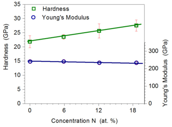 Influence of nitrogen concentration in the coating on the hardness and Young’s modulus of Mo-Mo2N coatings.