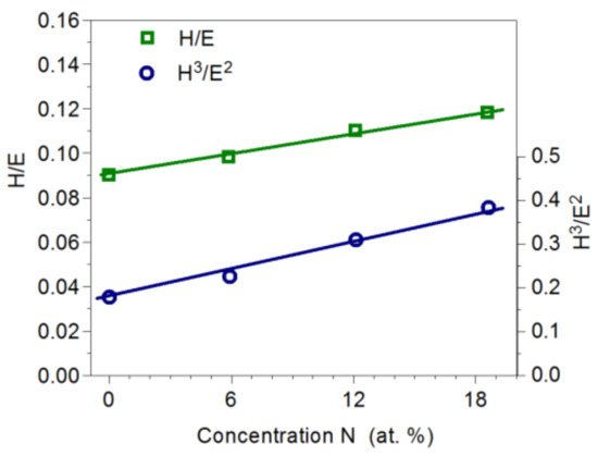 The H/E quotient carries information about resistance to damage during elastic deformations and the H3/E2 coefficient about resistance to plastic deformation. High values of the H/E and H3/E2 ratios ensure favorable tribological properties. Therefore, in the production of coatings, high hardness and low Young’s modulus should be sought. The H/E and H3/E2 ratios in the tested coatings were favorable. With an increase in nitrogen concentration in the coating from 0 to 18.6 at%, the H/E ratio changed from 0.090 to 0.118, while the H3/E2 ratio changed from 0.178 to 0.383 (Figure 7). Favorable values of the H/E and H3/E2 coefficients result from the relatively low Young’s modulus (230–240) GPa of the coating. Values of Young’s modulus for Mo2N nitride reported in the literature range from 380 GPa to 400 GPa [10,23].