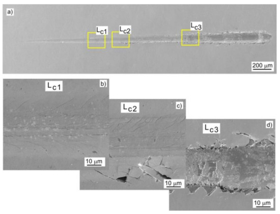 Adhesion of the coating to the substrate was determined by the scratch test method. Based on the analysis of changes in the value of friction force, acoustic emission signal and microscopic observations, the critical loads Lc1, Lc2, and Lc3 were determined, at which cohesive cracking, adhesive cracking, and coating delamination from the substrate occurred, respectively. Figure 8 shows a SEM image of the Mo-(0.6N) coating after the scratch test. Initially, cohesive angular and longitudinal cracks appeared in the coatings, which gradually turned into transverse cracks along the entire width of the scratch (Figure 8b). The first adhesive cracks, in the form of loosening and lifting of the coating from the substrate, were observed along the edge of the scratch (Figure 8c). In the last stage of coating destruction, the coating was delaminated from the substrate over the entire width of the scratch (Figure 8d). The highest loads of the Lc1 and Lc2 were recorded for the Mo-(0.6N) coating with the highest nitrogen content of 18.6 at.%. This proves high adhesion of the coating to the substrate. In coatings with nitrogen concentration of 12.1 at.%, the lowest values of all critical loads were recorded (Figure 9). Single-phase Mo, Mo-(0.2) coatings, are characterized by comparable adhesion. In the case of two-phase coatings Mo-(0.4N), Mo-(0.6), coating with the higher nitrogen content shows better adhesion. Mechanism of coating destruction during the scratch test for all Mo-Mo2N coatings was similar.