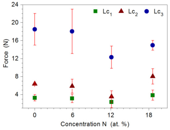 The values of the critical loads Lc1, Lc2, and Lc3, in relation to the nitrogen concentration in the Mo-Mo2N coating.