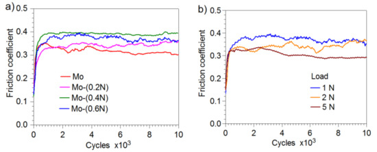 Friction coefficient: (a) Mo-Mo2N coatings produced at various nitrogen flow rates, load 1 N, (b) Mo- (0.6N) coatings at various loads.