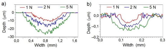 To calculate wear factor for a coating, measurements of the friction trace profile were performed along the line perpendicular to the direction of friction. Sample profiles for the Ti6Al4V substrate and Mo-(0.6 N) coating are shown in Figure 11. The substrate was characterized by a low wear resistance. The depth of the friction trace varied from 9 µm (F = 1 N) to 25 µm (F = 5 N). The depth of the friction trace in the tested Mo-Mo2N coatings ranged from 0.07 µm (F = 1 N) to 0.14 µm (F = 5 N) and was 20–30 times smaller than in the base material.