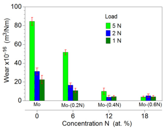 The Mo-Mo2N nanocomposite coatings under the evaluation were characterized by a low wear coefficient. With the increase in nitrogen concentration in the nanocomposite coating, there was a clear improvement in its resistance to tribological wear (Figure 12). The wear coefficient of the two-phase Mo-(0.4N) and Mo-(0.6N) coatings for the 5 N load was, respectively, 10 × 10−16 m3/N∙m and 4.0 × 10−16 m3/N∙m. For the single-phase Mo and Mo-(0.2N) coatings, the wear coefficient was 84.5 × 10−16 m3/N∙m and 51.6 × 10−16 m3/N∙m, respectively. The wear factor determined for the Ti6Al4V substrate was three orders of magnitude higher, in relation to the Mo-(0.6) coating. In the case of the Mo-(0.6) coating, the load force of the friction junction does not affect the wear factor.