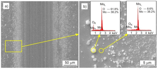 The type and proportion of surface molybdenum oxides depends on the oxidation conditions, such as the type of medium (air, water vapor), as well as temperature and pressure. The main passivation oxide in the air environment is MoO2 [54]. Under the conditions of the tribological test, oxides are inevitably formed on the molybdenum surface, and moving the Al2O3 ball across the coating reveals the unoxidized molybdenum surface and contributes to the intensification of the oxidation process. The EDS analysis performed in the area of the oxide shows the presence of oxides chemically close to MoO2 oxide, Figure 13b.