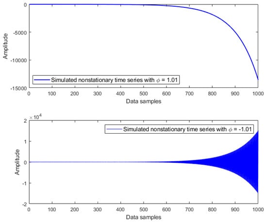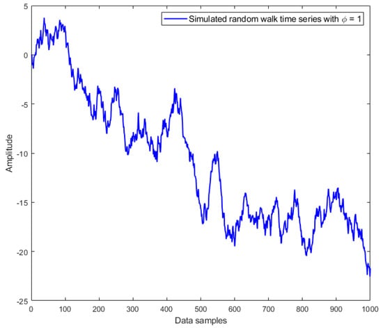 Figure 2. Simulated nonstationary time series with coefficients and . - For , we have a random walk time series, which moves up and down; it behaves as a nonstationary time series but slowly, as plotted in Figure 3.