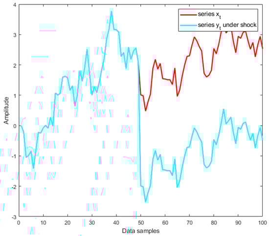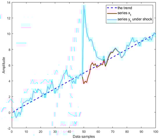 In both examples presented in Figure 4 and Figure 5, two identical time series and were used; however, the shock was only inserted into the time series at data sample 50. In addition, Figure 5 shows that both time series and followed a deterministic linear trend , where is discrete points of time. In this case, is a trend-stationary process, and it can be observed in Figure 5 that the shock has transitory effects on , and the series could return to its original path and then continue by varying around the trend as the same series . However, if is a unit root process, one can observe in Figure 4 that the shock has permanent effects on ; therefore, the series could not return to its original path and continues following the new path.