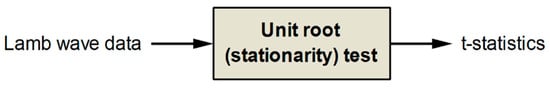 In the context of this study, since the methodology proposed for damage detection is based on stationary statistical characteristics of Lamb wave data (presented in the form of time series), an important question that is raised is how do we measure the stationarity of a Lamb wave signal? The answer for this question is that, in principle, the degree of stationarity (or nonstationarity) of a signal or a time series can be quantified by using a unit root test [18]. This has been confirmed for the case of ADF test in the previous investigations [8,27,28,29,30,31], which can be stated as “the more negative the ADF t-statistics are, the more stationary the analysed data are”. Following the approach, we have proposed a general stationarity calculation procedure for Lamb wave based structural damage evaluation in this paper, as shown in Figure 6. In essence, the unit root (or stationarity) test is applied to Lamb wave data to calculate their t-statistics, which are then used as damage-sensitive indicators. The resulting t-statistics, exhibiting quantitatively the stationarity of Lamb wave responses, are used for detecting abnormal problems in the structure of interest. In this investigation, the four unit root testing methods, described in Section 2.4, are considered for the stationarity calculation procedure.