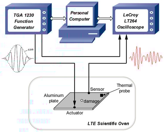 Lamb wave experimental data used in this study originate from a series of experiments described in [35]. The experiments used a pitch-catch configuration of Lamb wave propagation. The specimen was an aluminium plate of 2 mm thickness, had a rectangular shape (200 × 150 mm), instrumented two low-profile, and had surface-bonded piezoceramic Sonox P155 transducers (diameter 10 mm, thickness 1 mm). One transducer was used for Lamb wave generation and another one for response sensing. A five-cycle 75 kHz cosine burst signal was used as an excitation signal for the generation of Lamb waves. The excitation signal was enveloped by using a half-cosine function. The maximum peak-to-peak amplitude of excitation was chosen at 10 V. The experimental setup is illustrated in Figure 7. A TGA 1230 arbitrary waveform generator was used to generate excitation signals. A digital 4-channel LeCroy LT264 oscilloscope was used to acquire Lamb wave responses. In order to obtain Lamb wave data for various temperature levels, the instrumented aluminium plate was placed in a 100 L LTE Scientific oven during the experimental process. The temperature on the surface of the plate was measured by using a thermal probe.