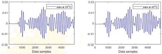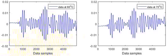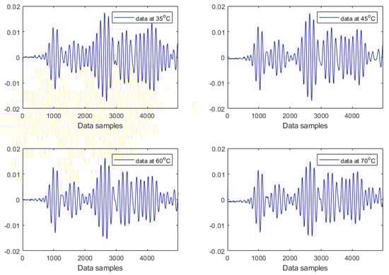 This study has used Lamb wave data acquired at four different temperatures (35 °C, 45 °C, 60 °C, and 70 °C) for both intact and damaged cases. This forms an experimental case study of Lamb wave based SHM under temperature variations. More specifically, four temperature-dependent data sets for each damage condition have been analysed. Each data set at a certain temperature level consists of 20 Lamb wave responses, which are formed by randomly selecting five measurements at each heating or cooling phase. For example, the first data set for the intact plate at 35 °C consists of five measurements at the first heating step, five measurements at the first cooling step, five measurements at the second heating step, and five measurements at the second cooling step. Varying temperatures have caused strong effects on the investigated Lamb wave data, as reported previously in [35] and recently in [8]. Figure 8 and Figure 9 provide examples of Lamb wave responses at different temperature levels for intact and damaged cases, respectively. The first wave packet in all plots is a symmetrical Lamb wave mode. The successive wave packets are reflections from the boundaries and damage (in the case of Figure 9). It can be observed from Figure 8 and Figure 9 that the amplitudes and shapes of Lamb wave responses slightly changed due to both damage and temperature. These responses consist of different wave packages (dispersed incident waves, reflected components, and scattered components of two wave modes, i.e., A0 and S0 Lamb wave modes). These responses are nonstationary by definition; statistical properties change over time. All responses change due to two effects, i.e., structural damage and due to temperature. Figure 8 and Figure 9 demonstrate that these effects are not clearly visible and are difficult to separate. Both effects introduce a trend to these responses. However, it is hard to recognize any clear trends in the data. It was discussed in [36] that varying temperatures could affect surface bonding (adhesion) between transducers and the structure, resulting in the variations in both the amplitude and the phase of the signal. Recently, the work in [37] has provided a comprehensive review of the effects of environmental and operational conditions (EOCs) on Lamb wave propagation in various structures. A number of efficient strategies for the compensation and/or removal of EOCs effects for Lamb wave based SHM systems have been highlighted in the review.