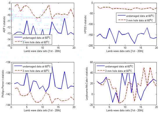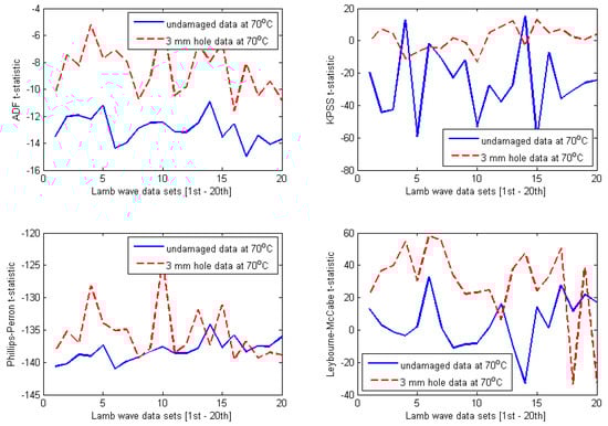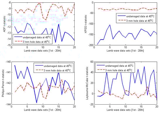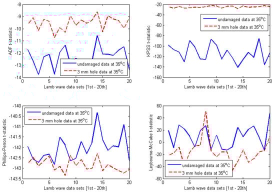 This section presents an application of the proposed structural damage detection method using unit root or stationarity tests (presented in Section 3) for Lamb wave experimental data contaminated by varying temperatures (described in Section 4). Four different unit root tests, i.e., ADF, KPSS, PP, and LM test, have been used to assess the stationarity of Lamb wave data before and after the damage introduced to the specimen. The capability of the analysed tests for damage detection is compared and discussed.