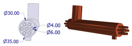 The horizontal and vertical pitch of the tube bundle were Pt = 0.01 m and Pv = 0.01 m, respectively. The channels were arranged in a parallel configuration as shown in Figure 2. The exchanger was equipped with inlet connections and an outlet, which were, respectively, the supply and return of the exchanger with the refrigerant. The exchanger body has been sealed with two copper lids 2 mm thick with seven holes each. The holes with an inside diameter equal to the outside diameter of the cooling channels were arranged in parallel in three adjacent rows. All components of the exchanger were connected together by brazing.
