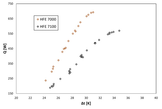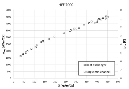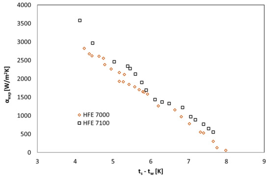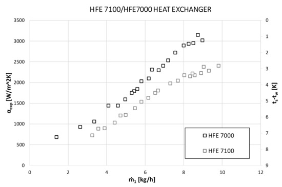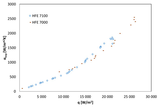 Figure 4, Figure 5 and Figure 6 show the thermal characteristics of the tested heat exchanger in the form of the dependence of the heat transfer coefficient on the heat flux density on the cooled surface, αexp = f(q), the mass flow rate αexp = f(ṁ), and the difference between saturation temperature and the outer wall of the channel temperature α = f(ts − tw). All pipe channels participated in the heat transfer, n = 7. The presented characteristics for the two refrigerants HFE 7000 and HFE 7100 are very similar due to their similar thermal properties.