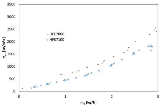 Thermal characteristics of the tested exchanger in the form of the dependence of the heat transfer coefficient on the mass flow rate α = f (ṁ1), refrigerant HFE 7100, HFE 7000.