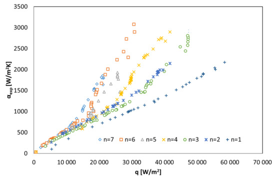 The data illustrated in Figure 7 show a clear dependence of the heat transfer coefficient on the heat flux density. The relationship is visible for all analyzed variants of the coolant flow (number of active channels varies within n = {1; 7}). The higher the value of the heat flux density, the greater the heat exchange intensity caused by higher values of the heat transfer coefficient αexp. The highest values of the heat transfer coefficient at q = const. have been noted at the maximum number of active cooling channels n. The reason is the increase in the heat exchange surface, which occurs when successive active channels are introduced into the condensation process. The increase of the heat exchange surface directly affects the reduction of the saturation temperature difference and the wall temperature (ts − tw) and the decrease of the condensate thickness on the outer surface of the horizontal tube of the exchanger. This is due to the comparison of the formulas for Fourier’s law and Newton’s law for the boundary layer in the form of a condensate film. Hence: