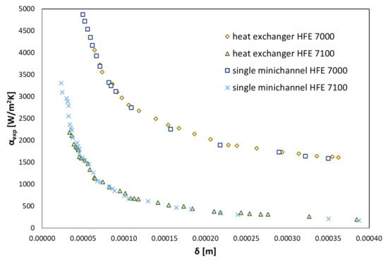 Experimental data of the dependence of the heat transfer coefficient on the condensate thickness of the HFE 7000 and HFE 7100 refrigerants.