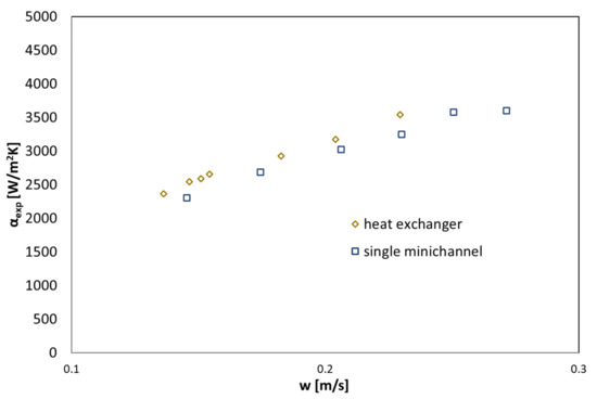 Experimental studies of the condensation process were carried out while maintaining a constant saturation (condensation) temperature of the refrigerant at the level of about 32 °C. During the experimental tests, the changes in this temperature amounted to ±2 K. The change in the difference between the condensation temperature and the wall temperature of the pipe channel surface was caused by changing the temperature of the cooling water at the inlet to the exchanger. Therefore, it can be concluded that the presented values of the heat transfer coefficient are given for a constant (almost constant) condensation temperature of the medium in the range of 32 (±2) °C. From Equation (1), the dependence on the heat transfer coefficient αexp is obtained in the form: