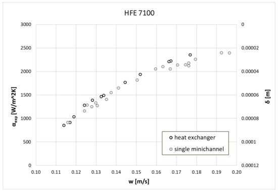 where δ is the thickness of refrigerant condensate on the external surface of heat exchanger’s channel, L is the minichannel’s length, w is the condensate velocity. The use of Equations (7) and (8) made it possible to develop the characteristics of the condensation process in the form of the common dependence of the heat transfer coefficient α and the thickness of the condensate film δ on the condensate velocity on the cooled wall of the channel. Figure 9 and Figure 10 show such dependencies for both tested refrigerants in the case of one active exchanger tube and all seven.